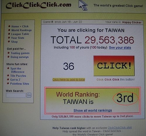 這兩天在twitter上面,除了『星光效應』被討論得火熱之外,好友們又找到了一個號稱“雖然覺得無聊卻又忍不住想去參一腳的遊戲 -- Clickclickclick”, skyvee的形容非常貼切,Clickclickclick真的是那種你不玩還好,但是看過網頁之後,會勾起你『想贏』的鬥志,點個不停。