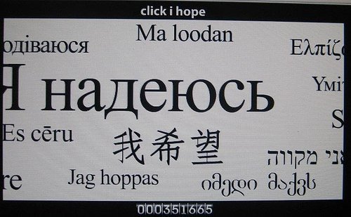 今年的威尼斯雙年展中,俄羅斯國家館有鑒於現代人是那麼地渴慕希望,於是推出了『點擊希望 Click I Hope』,其中有七十多個國家所使用的五十多種語言,都在這個展的LED上,俄羅斯國家館也做了網站,讓世界各地的網友都可以用點擊畫面上自己的語言,表達出自己是多麼地希望,希望能成真‧‧‧,看哪一個族群最渴慕希望!